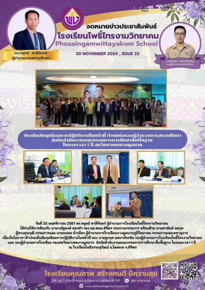 วันที่ 20 พฤศจิกายน 2567 ดร.ทยุทธ์ สาลีจันทร์ ผู้อำนวยการโรงเรียนโพธิ์ไทรงามวิทยาคม ได้ร่วมให้การต้อนรับ นายวณัฐพงศ์ ทองคำ รอง ผอ.สพม.พิจิตร ประธานกรรมการ พร้อมด้วย นายสายันห์ หอกุล ผู้ทรงคุณวุฒิ กรรมการและ นายธนพล ฉ่ำเพียร ผู้อำนวยการโรงเรียนบางมูลนากภูมิวิทยาคม กรรมการและเลขานุการ เนื่องในโอกาส เข้าประเมินสัมฤทธิผลการปฏิบัติงานในหน้าที่ ของ นายฐกฤต ยศมาภัทรชัย รองผู้อำนวยการโรงเรียนโพธิ์ไทรงามวิทยาคม และ รองผู้อำนวยการโรงเรียน ของสหวิทยาเขตบางมูลนาก สังกัดสำนักงานคณะกรรมการการศึกษาขั้นพื้นฐาน ในระยะเวลา 1 ปี ณ โรงเรียนโพธิธรรมสุวัฒน์ อ.โพทะเล จ.พิจิตร