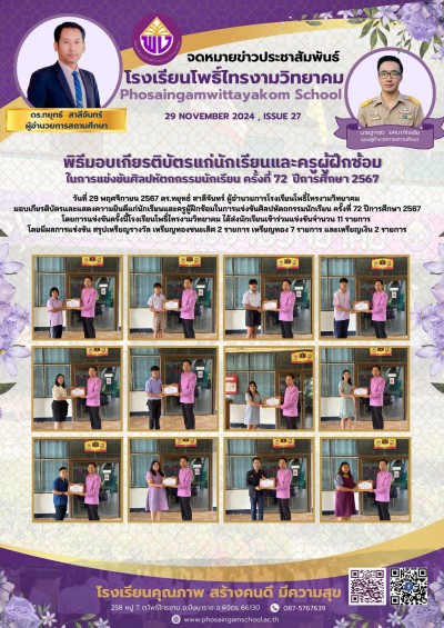 วันที่ 29 พฤศจิกายน 2567 ดร.ทยุทธ์ สาลีจันทร์ ผู้อำนวยการโรงเรียนโพธิ์ไทรงามวิทยาคม มอบเกียรติบัตรและแสดงความยินดีแก่นักเรียนและครูผู้ฝึกซ้อมในการแข่งขันศิลปหัตถกรรมนักเรียน ครั้งที่ 72 ปีการศึกษา 2567 โดยการแข่งขันครั้งนี้โรงเรียนโพธิ์ไทรงามวิทยาคม ได้ส่งนักเรียนเข้าร่วมแข่งขันจำนวน 11 รายการ โดยมีผลการแข่งขัน สรุปเหรียญรางวัล เหรียญทองชนะเลิศ 2 รายการ เหรียญทอง 7 รายการ และเหรียญเงิน 2 รายการ