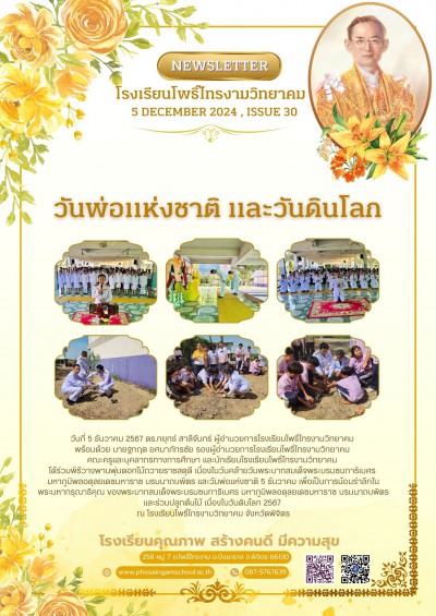 วันที่ 5 ธันวาคม 2567 ดร.ทยุทธ์ สาลีจันทร์ ผู้อำนวยการโรงเรียนโพธิ์ไทรงามวิทยาคม พร้อมด้วย นายฐกฤต ยศมาภัทรชัย รองผู้อำนวยการโรงเรียนโพธิ์ไทรงามวิทยาคม คณะครูและบุคลากรทางการศึกษา และนักเรียนโรงเรียนโพธิ์ไทรงามวิทยาคม ได้ร่วมพิธีวางพานพุ่มดอกไม้ถวายราชสดุดี เนื่องในวันคล้ายวันพระบาทสมเด็จพระบรมชนกาธิเบศร มหาภูมิพลอดุลยเดชมหาราช บรมนาถบพิตร และวันพ่อแห่งชาติ 5 ธันวาคม เพื่อเป็นการน้อมรำลึกใน พระมหากรุณาธิคุณ ของพระบาทสมเด็จพระบรมชนกาธิเบศร มหาภูมิพลอดุลยเดชมหาราช บรมนาถบพิตร และร่วมปลูกต้นไม้ เนื่องในวันดินโลก 2567 ณ โรงเรียนโพธิ์ไทรงามวิทยาคม จังหวัดพิจิตร