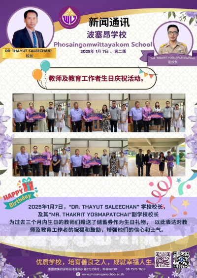 2025年1月7日,“Dr. Thayut Saleechan” 学校校长, 及其“Mr. Thakrit Yosmapatchai”副学校校长 为过去三个月内生日的教师们赠送了储蓄券作为生日礼物, 以此表达对教师及教育工作者的祝福和鼓励,增强他们的信心和士气。