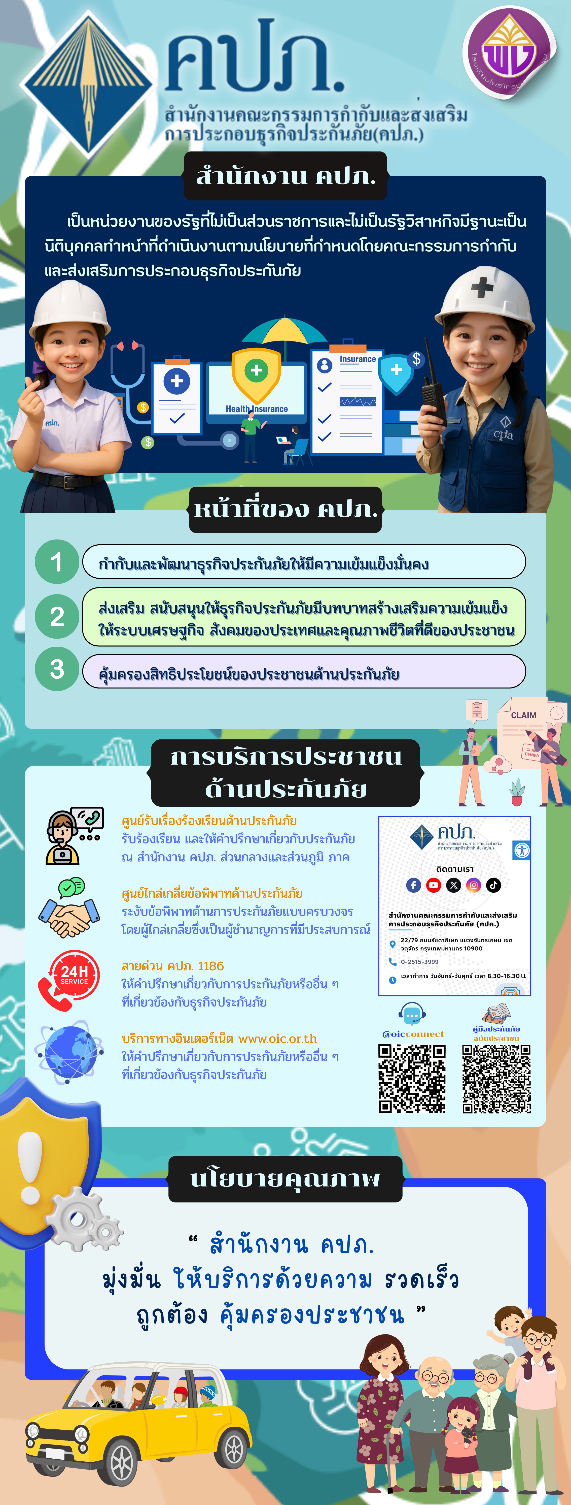 สำนักงาน คปภ. เป็นหน่วยงานของรัฐที่ไม่เป็นส่วนราชการและไม่เป็นรัฐวิสาหกิจ มีฐานะเป็นนิติบุคคลทำหน้าที่ ดำเนินงานตามนโยบายที่กำหนด โดยคณะกรรมการกำกับและส่งเสริมการประกอบธุรกิจประกันภัย มีภารกิจ ดังนี้