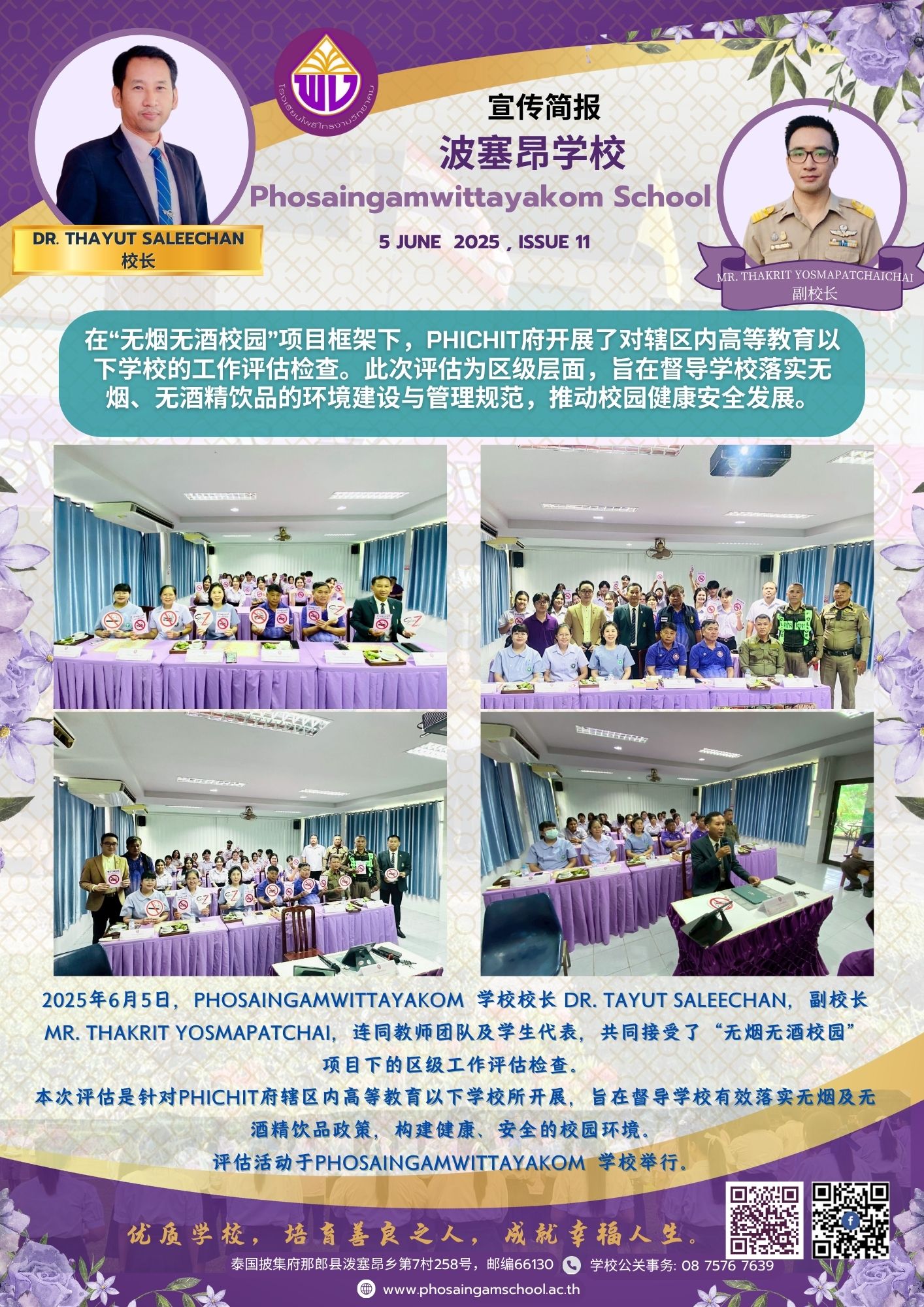 2025年6月5日,Phosaingamwittayakom 学校校长 Dr. Tayut Saleechan,副校长 Mr. Thakrit Yosmapatchai,连同教师团队及学生代表,共同接受了“无烟无酒校园”
