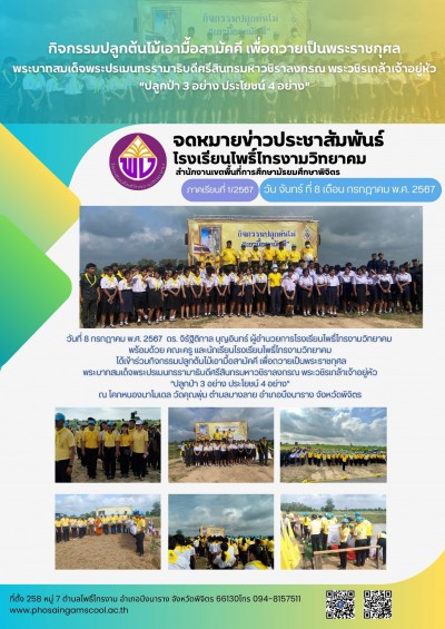 วันที่ 8 กรกฎาคม พ.ศ. 2567 ดร. จิรัฐิติกาล บุญอินทร์ ผู้อำนวยการโรงเรียนโพธิ์ไทรงามวิทยาคม พร้อมด้วย คณะครู และนักเรียนโรงเรียนโพธิ์ไทรงามวิทยาคม ได้เข้าร่วมกิจกรรมปลูกต้นไม้เอามื้อสามัคคี เพื่อถวายเป็นพระราชกุศล พระบาทสมเด็จพระปรเมนทรรามาธิบดีศรีสินทรมหาวชิราลงกรณ พระวชิรเกล้าเจ้าอยู่หัว “ปลูกป่า 3 อย่าง ประโยชน์ 4 อย่าง” ณ โคกหนองนาโมเดล วัดคุณพุ่ม ตำบลบางลาย อำเภอบึงนาราง จังหวัดพิจิตร