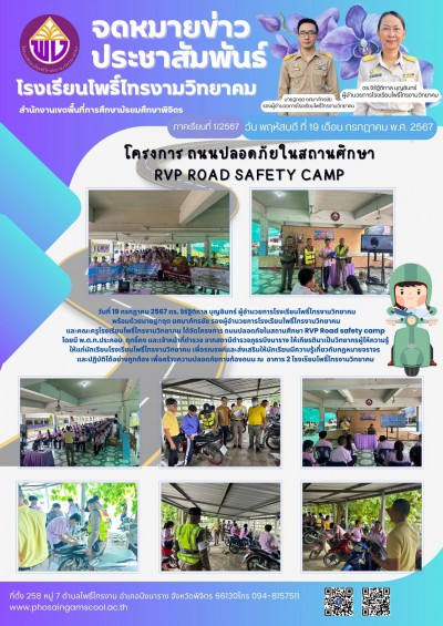 วันที่ 19 กรกฎาคม 2567 ดร. จิรัฐิติกาล บุญอินทร์ ผู้อำนวยการโรงเรียนโพธิ์ไทรงามวิทยาคม พร้อมด้วยนายฐกฤต ยศมาภัทรชัย รองผู้อำนวยการโรงเรียนโพธิ์ไทรงามวิทยาคม และคณะครูโรงเรียนโพธิ์ไทรงามวิทยาคม ได้จัดโครงการ ถนนปลอดภัยในสถานศึกษา RVP Road safety camp โดยมี พ.ต.ท.ประกอบ ฤทธิ์คง และเจ้าหน้าที่ตำรวจ จากสถานีตำรวจภูธรบึงนาราง ให้เกียรติมาเป็นวิทยากรผู้ให้ความรู้ ให้แก่นักเรียนโรงเรียนโพธิ์ไทรงามวิทยาคม เพื่อรณรงค์และส่งเสริมให้นักเรียนมีความรู้เกี่ยวกับกฎหมายจราจร และปฏิบัติได้อย่างถูกต้อง เพื่อสร้างความปลอดภัยทางท้องถนน ณ อาคาร 2 โรงเรียนโพธิ์ไทรงามวิทยาคม