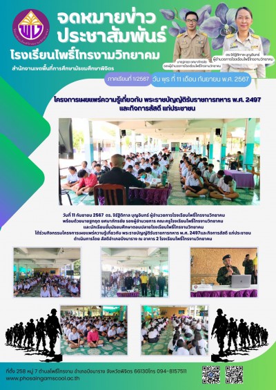 วันที่ 11 กันยายน 2567 ดร. จิรัฐิติกาล บุญอินทร์ ผู้อำนวยการโรงเรียนโพธิ์ไทรงามวิทยาคม พร้อมด้วยนายฐกฤต ยศมาภัทรชัย รองผู้อำนวยการ คณะครูโรงเรียนโพธิ์ไทรงามวิทยาคม และนักเรียนชั้นมัธยมศึกษาตอนปลายโรงเรียนโพธิ์ไทรงามวิทยาคมได้ร่วมกิจกรรมโครงการเผยแพร่ความรู้เกี่ยวกับ พระราชบัญญัติรับราชการทหาร พ.ศ. 2497และกิจการสัสดี แก่ประชาชน ดำเนินการโดย สัสดีอำเภอบึงนาราง ณ อาคาร 2 โรงเรียนโพธิ์ไทรงามวิทยาคม