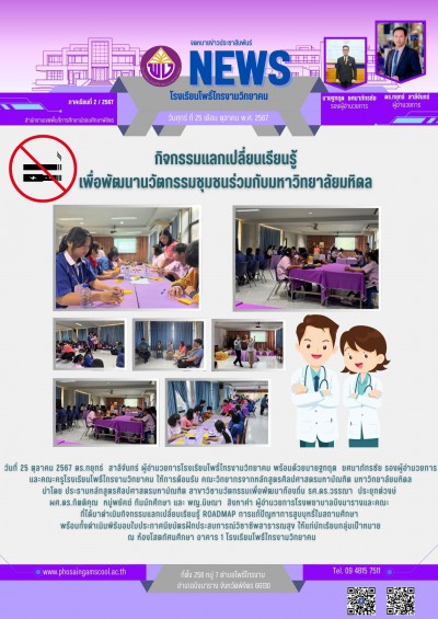 วันที่ 25 ตุลาคม 2567 ดร.ทยุทธ์ สาลีจันทร์ ผู้อำนวยการโรงเรียนโพธิ์ไทรงามวิทยาคม พร้อมด้วยนายฐกฤต ยศมาภัทรชัย รองผู้อำนวยการ และคณะครูโรงเรียนโพธิ์ไทรงามวิทยาคม ให้การต้อนรับ คณะวิทยากรจากหลักสูตรศิลปศาสตรมหาบัณฑิต มหาวิทยาลัยมหิดล นำโดย ประธานหลักสูตรศิลปศาสตรมหาบัณฑิต สาขาวิชานวัตกรรมเพื่อพัฒนาท้องถิ่น รศ.ดร.วรรณา ประยุกต์วงษ์ ผศ.ดร.กิตติคุณ หมู่พยัคฆ์ ทีมนักศึกษา และ พญ.นิษณา สิงหาคำ ผู้อำนวยการโรงพยาบาลบึงนารางและคณะ ที่ได้มาดำเนินกิจกรรมแลกเปลี่ยนเรียนรู้ ROADMAP การแก้ปัญหาการสูบบุหรี่ในสถานศึกษา พร้อมทั้งดำเนินพิธีมอบใบประกาศนียบัตรฝึกประสบการณ์วิชาชีพสาธารณสุข ให้แก่นักเรียนกลุ่มเป้าหมาย ณ ห้องโสตทัศนศึกษา อาคาร 1 โรงเรียนโพธิ์ไทรงามวิทยาคม
