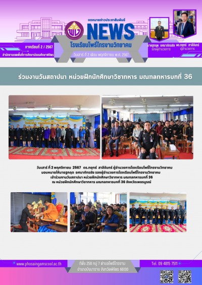 วันเสาร์ ที่ 2 พฤศจิกายน 2567 ดร.ทยุทธ์ สาลีจันทร์ ผู้อำนวยการโรงเรียนโพธิ์ไทรงามวิทยาคม มอบหมายให้นายฐกฤต ยศมาภัทรชัย รองผู้อำนวยการโรงเรียนโพธิ์ไทรงามวิทยาคม เข้าร่วมงานวันสถาปนา หน่วยฝึกนักศึกษาวิชาทหาร มณฑลทหารบกที่ 36 ณ หน่วยฝึกนักศึกษาวิชาทหาร มณฑลทหารบกที่ 36 จังหวัดเพชรบูรณ์