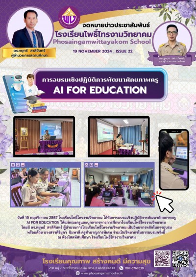 วันที่ 19 พฤศจิกายน 2567 โรงเรียนโพธิ์ไทรงามวิทยาคม ได้จัดการอบรมเชิงปฏิบัติการพัฒนาศักยภาพครู AI FOR EDUCATION ให้แก่คณะครูและบุคลากรทางการศึกษาโรงเรียนโพธิ์ไทรงามวิทยาคม โดยมี ดร.ทยุทธ์ สาลีจันทร์ ผู้อำนวยการโรงเรียนโพธิ์ไทรงามวิทยาคม เป็นวิทยากรหลักในการอบรม พร้อมด้วย นางสาวศิริยุภา ฉิมพาลี ครูชำนาญการพิเศษ ร่วมเป็นวิทยากรในการอบรมครั้งนี้ ณ ห้องโสตทัศนศึกษา โรงเรียนโพธิ์ไทรงามวิทยาคม