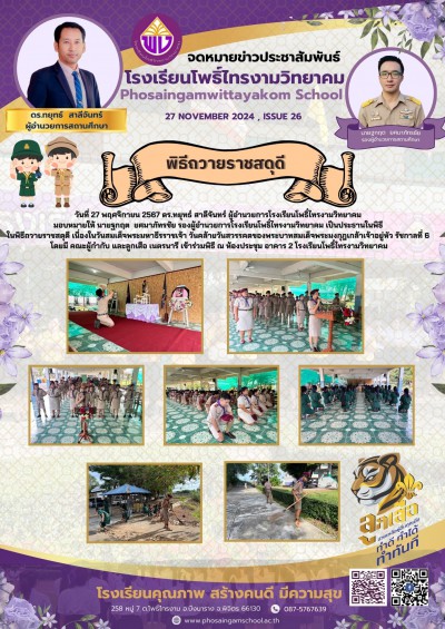 วันที่ 27 พฤศจิกายน 2567 ดร.ทยุทธ์ สาลีจันทร์ ผู้อำนวยการโรงเรียนโพธิ์ไทรงามวิทยาคม มอบหมายให้ นายฐกฤต ยศมาภัทรชัย รองผู้อำนวยการโรงเรียนโพธิ์ไทรงามวิทยาคม เป็นประธานในพิธี ในพิธีถวายราชสดุดี เนื่องในวันสมเด็จพระมหาธีรราชเจ้า วันคล้ายวันสวรรคตของพระบาทสมเด็จพระมงกุฎเกล้าเจ้าอยู่หัว รัชกาลที่ 6 โดยมี คณะผู้กำกับ และลูกเสือ เนตรนารี เข้าร่วมพิธี ณ ห้องประชุม อาคาร 2 โรงเรียนโพธิ์ไทรงามวิทยาคม