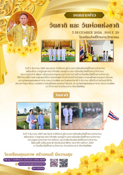 วันที่ 5 ธันวาคม 2567 ดร.ทยุทธ์ สาลีจันทร์ ผู้อำนวยการโรงเรียนโพธิ์ไทรงามวิทยาคม พร้อมด้วย นายฐกฤต ยศมาภัทรชัย รองผู้อำนวยการโรงเรียนโพธิ์ไทรงามวิทยาคม และนายประสาร พัฒยา ตัวแทนคณะครูและบุคลากรทางการศึกษาโรงเรียนโพธิ์ไทรงามวิทยาคม ได้เข้าร่วมพิธีวางพานพุ่มดอกไม้ถวายราชสดุดี เนื่องในวันคล้ายวันพระบาทสมเด็จพระบรมชนกาธิเบศร มหาภูมิพลอดุลยเดชมหาราช บรมนาถบพิตร และวันพ่อแห่งชาติ 5 ธันวาคม เพื่อเป็นการน้อมรำลึกใน พระมหากรุณาธิคุณ ของพระบาทสมเด็จพระบรมชนกาธิเบศร มหาภูมิพลอดุลยเดชมหาราช บรมนาถบพิตร ณ ที่ว่าการอำเภอบึงนาราง จังหวัดพิจิตร