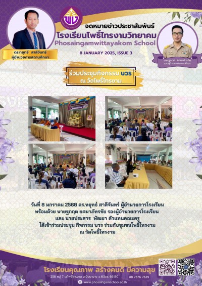 วันที่ 8 มกราคม 2568 ดร.ทยุทธ์ สาลีจันทร์ ผู้อำนวยการโรงเรียน พร้อมด้วย นายฐกฤต ยศมาภัทรชัย รองผู้อำนวยการโรงเรียน และ นายประสาร พัฒยา ตัวแทนคณะครู ได้เข้าร่วมประชุม กิจกรรม บวร ร่วมกับชุมชนโพธิ์ไทรงาม ณ วัดโพธิ์ไทรงาม