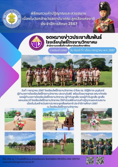 วันที่ 1 กรกฎาคม 2567 โรงเรียนโพธิ์ไทรงามวิทยาคม นำโดย ดร. จิรัฐิติกาล บุญอินทร์ ผู้อำนวยการโรงเรียนโพธิ์ไทรงามวิทยาคม ประธานในพิธี พร้อมด้วยนายฐกฤต ยศมาภัทรชัย รองผู้อำนวยการโรงเรียนโพธิ์ไทรงามวิทยาคม ผู้กำกับลูกเสือ รองผู้กำกับลูกเสือ ลูกเสือ และเนตรนารี โรงเรียนโพธิ์ไทรงามวิทยาคม ได้เข้าร่วมพิธีทบทวนคำปฏิญาณและสวนสนาม เนื่องในวันคล้ายวันสถาปนาคณะลูกเสือแห่งชาติ ประจำปีการศึกษา 2567 ณ โรงเรียนโพธิ์ไทรงามวิทยาคม