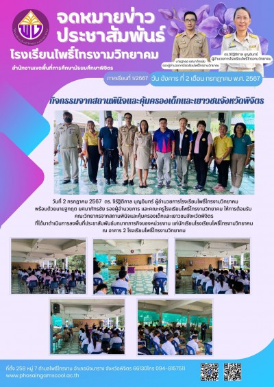 วันที่ 2 กรกฎาคม 2567 ดร. จิรัฐิติกาล บุญอินทร์ ผู้อำนวยการโรงเรียนโพธิ์ไทรงามวิทยาคม พร้อมด้วยนายฐกฤต ยศมาภัทรชัย รองผู้อำนวยการ และคณะครูโรงเรียนโพธิ์ไทรงามวิทยาคม ให้การต้อนรับ คณะวิทยากรจากสถานพินิจและคุ้มครองเด็กและเยาวชนจังหวัดพิจิตร ที่ได้มาดำเนินการลงพื้นที่ประชาสัมพันธ์บทบาทภารกิจของหน่วยงาน แก่นักเรียนโรงเรียนโพธิ์ไทรงามวิทยาคม ณ อาคาร 2 โรงเรียนโพธิ์ไทรงามวิทยาคม