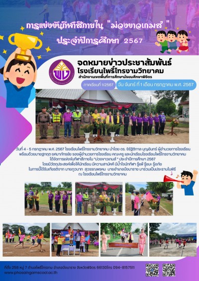 วันที่ 4 - 5 กรกฎาคม พ.ศ. 2567 โรงเรียนโพธิ์ไทรงามวิทยาคม นำโดย ดร. จิรัฐิติกาล บุญอินทร์ ผู้อำนวยการโรงเรียน พร้อมด้วยนายฐกฤต ยศมาภัทรชัย รองผู้อำนวยการโรงเรียน คณะครู และนักเรียนโรงเรียนโพธิ์ไทรงามวิทยาคม ได้จัดการแข่งขันกีฬาสีภายใน "ม่วงขาวเกมส์ " ประจำปีการศึกษา 2567 โดยมีวัตถุประสงค์เพื่อให้นักเรียน มีความสามัคคี มีน้ำใจนักกีฬา รู้แพ้ รู้ชนะ รู้อภัย ในการนี้ได้รับเกียรติจาก นายภูวนาท สุวรรณพรหม นายอำเภอบึงนาราง มาร่วมเป็นประธานในพิธี ณ โรงเรียนโพธิ์ไทรงามวิทยาคม