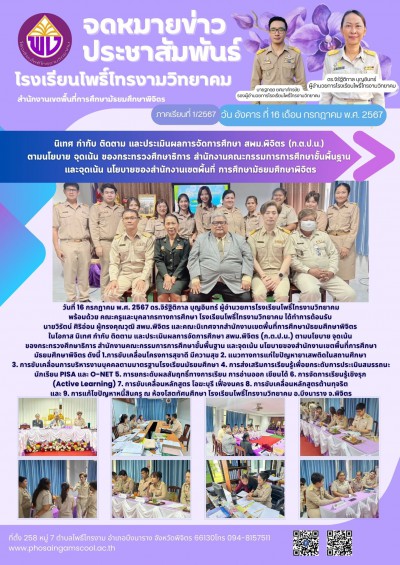 วันที่ 16 กรกฎาคม พ.ศ. 2567 ดร.จิรัฐิติกาล บุญอินทร์ ผู้อำนวยการโรงเรียนโพธิ์ไทรงามวิทยาคม พร้อมด้วย คณะครูและบุคลากรทางการศึกษา โรงเรียนโพธิ์ไทรงามวิทยาคม ได้ทำการต้อนรับ นายวิรัตน์ ศิริอ่อน ผู้ทรงคุณวุฒิ สพม.พิจิตร และคณะนิเทศจากสำนักงานเขตพื้นที่การศึกษามัธยมศึกษาพิจิตร ในโอกาส นิเทศ กำกับ ติดตาม และประเมินผลการจัดการศึกษา สพม.พิจิตร (ก.ต.ป.น.) ตามนโยบาย จุดเน้น ของกระทรวงศึกษาธิการ สำนักงานคณะกรรมการการศึกษาขั้นพื้นฐาน และจุดเน้น นโยบายของสำนักงานเขตพื้นที่การศึกษามัธยมศึกษาพิจิตร ดังนี้ 1.การขับเคลื่อนโครงการสุขาดี มีความสุข 2. แนวทางการแก่ไขปัญหายาเสพติดในสถานศึกษา 3. การขับเคลื่อนการบริหารงานบุคคลตามมาตรฐานโรงเรียนมัธยมศึกษา 4. การส่งเสริมการเรียนรู้เพื่อยกระดับการประเมินสมรรถนะนักเรียน PISA และ O-NET 5. การยกระดับผลสัมฤทธิ์ทางการเรียน การอ่านออก เขียนได้ 6. การจัดการเรียนรู้เชิงรุก (Active Learning) 7. การขับเคลื่อนหลักสูตร โอฆะบุรี เฟื่องนคร 8. การขับเคลื่อนหลักสูตรต้านทุจริต และ 9. การแก้ไขปัญหาหนี้สินครู ณ ห้องโสตทัศนศึกษา โรงเรียนโพธิ์ไทรงามวิทยาคม อ.บึงนาราง จ.พิจิตร