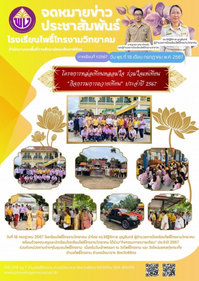 วันที่ 18 กรกฎาคม 2567 โรงเรียนโพธิ์ไทรงามวิทยาคม นำโดย ดร.จิรัฐิติกาล บุญอินทร์ ผู้อำนวยการโรงเรียนโพธิ์ไทรงามวิทยาคม พร้อมด้วยคณะครูและนักเรียนโรงเรียนโพธิ์ไทรงามวิทยาคม ได้ร่วม“กิจกรรมการถวายเทียน” ประจำปี 2567 ร่วมกับหน่วยงานต่างๆในชุมชนโพธิ์ไทรงาม เนื่องในวันเข้าพรรษา ณ วัดโพธิ์ไทรงาม และ วัดใหม่มงคลทุ่งกระทั่ง ตำบลโพธิ์ไทรงาม อำเภอบึงนาราง จังหวัดพิจิตร