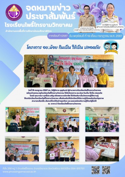 วันที่ 19 กรกฎาคม 2567 ดร. จิรัฐิติกาล บุญอินทร์ ผู้อำนวยการโรงเรียนโพธิ์ไทรงามวิทยาคม พร้อมด้วยคณะครูโรงเรียนโพธิ์ไทรงามวิทยาคม ได้จัดโครงการ อย.น้อย กินเป็น ใช้เป็น ปลอดภัย โดยมี คุณวาสนา ฤทธิ์ประเสริฐ อดีตพยาบาลวิชาชีพ ให้เกียรติมาเป็นวิทยากรผู้ให้ความรู้ ให้แก่นักเรียนโรงเรียนโพธิ์ไทรงามวิทยาคม เพื่อส่งเสริมให้นักเรียนได้มีความรู้เรื่องผลิตภัณฑ์สุขภาพ สามารถเลือกซื้อ เลือกบริโภคได้อย่างถูกต้อง และเผยแพร่องค์ความรู้ให้แก่ผู้อื่นได้ ณ อาคาร 2 โรงเรียนโพธิ์ไทรงามวิทยาคม