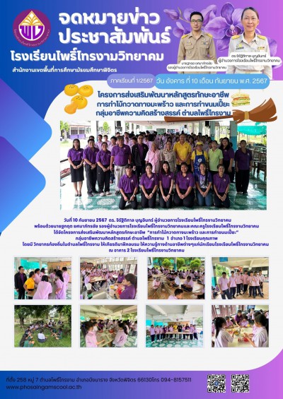 วันที่ 10 กันยายน 2567 ดร. จิรัฐิติกาล บุญอินทร์ ผู้อำนวยการโรงเรียนโพธิ์ไทรงามวิทยาคมพร้อมด้วยนายฐกฤต ยศมาภัทรชัย รองผู้อำนวยการโรงเรียนโพธิ์ไทรงามวิทยาคมและคณะครูโรงเรียนโพธิ์ไทรงามวิทยาคมได้จัดโครงการส่งเสริมพัฒนาหลักสูตรทักษะอาชีพ การทำไม้กวาดทางมะพร้าว และการทำขนมเปี๊ยะ กลุ่มอาชีพความคิดสร้างสรรค์ ตำบลโพธิ์ไทรงาม 1 อำเภอ 1 โรงเรียนคุณภาพโดยมี วิทยากรท้องถิ่นในตำบลโพธิ์ไทรงาม ให้เกียรติมาฝึกอบรม ให้ความรู้ทางด้านอาชีพต่างๆแก่นักเรียนโรงเรียนโพธิ์ไทรงามวิทยาคม ณ อาคาร 2 โรงเรียนโพธิ์ไทรงามวิทยาคม