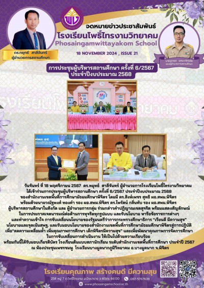 วันจันทร์ ที่ 18 พฤศจิกายน 2567 ดร.ทยุทธ์ สาลีจันทร์ ผู้อำนวยการโรงเรียนโพธิ์ไทรงามวิทยาคม ได้เข้าร่วมการประชุมผู้บริหารสถานศึกษา ครั้งที่ 6/2567 ประจำปีงบประมาณ 2568 ของสำนักงานเขตพื้นที่การศึกษามัธยมศึกษาพิจิตร โดยมี ดร.สิงห์เพชร สุทธิ ผอ.สพม.พิจิตร พร้อมด้วยนายวณัฐพงศ์ ทองคำ รอง ผอ.สพม.พิจิตร ดร.ไพรัตน์ กลิ่นทับ รอง ผอ.สพม.พิจิตร ผู้บริหารสถานศึกษาในสังกัด และ ผู้อำนวยการกลุ่ม ร่วมกล่าวคำปฏิญาณเขตสุจริต พร้อมแสดงสัญลักษณ์ ในการประกาศเจตนารมณ์ต่อต้านการทุจริตทุกรูปแบบ และรับนโยบาย หารือข้อราชการต่างๆ และทำความเข้าใจ การขับเคลื่อนนโยบายของรัฐมนตรีว่าการกระทรวงศึกษาธิการ “เรียนดี มีความสุข” นโยบายและจุดเน้นสพฐ. และรับมอบนโยบายของสำนักงานเขตพื้นที่การศึกษามัธยมศึกษาพิจิตรสู่การปฏิบัติ เพื่อ“ลดความเหลื่อมล้ำ เพิ่มคุณภาพการศึกษา เด็กพิจิตรมีความสุข” และเพื่อพัฒนาคุณภาพการจัดการศึกษา ในการขับเคลื่อนการดำเนินงาน ให้เป็นไปด้วยความเรียบร้อย พร้อมกันนี้ได้รับมอบเกียรติบัตร โรงเรียนต้นแบบสภานักเรียน ระดับสำนักงานเขตพื้นที่การศึกษา ประจำปี 2567 ณ ห้องประชุมเพชรชมพู โรงเรียนบางมูลนากภูมิวิทยาคม อ.บางมูลนาก จ.พิจิตร